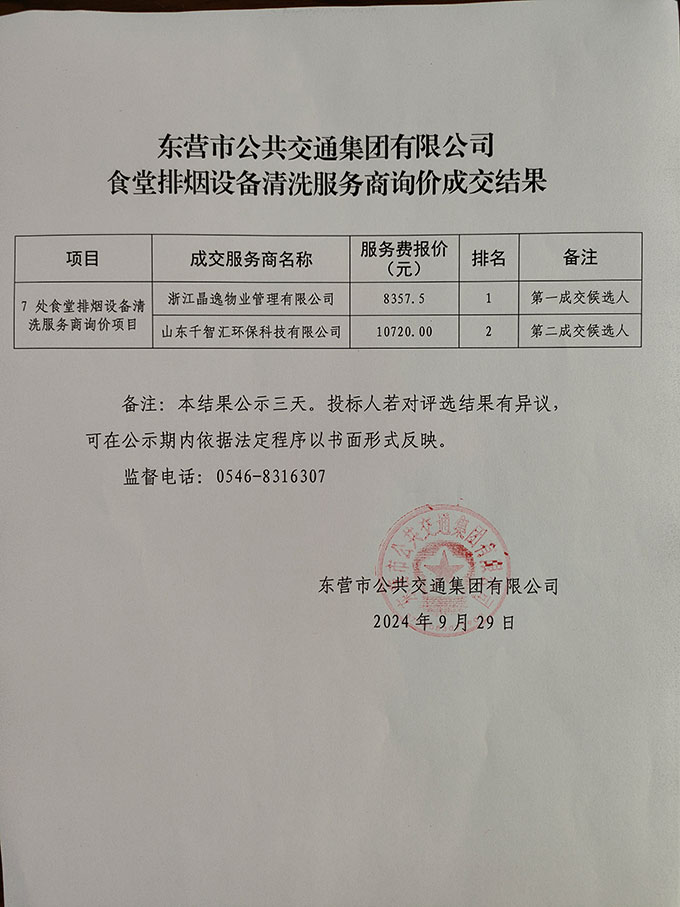 東營市公共交通集團(tuán)有限公司食堂排煙設(shè)備清洗服務(wù)商詢價成交結(jié)果