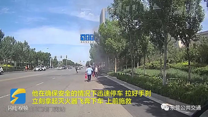 近日,東營38路公交車駕駛員李斌行駛至菏澤路與西三路路口西100米附近看到前方濃煙滾滾,他在確保安全的情況下迅速停車,拉好手剎,立刻拿起滅火器飛奔下車,上前施救。原來是一輛電動三輪車突然自燃冒煙,同時車上還攜帶大量電動單車,為了防止火勢迅速蔓延,他迅速撲救,火勢得到了控制。