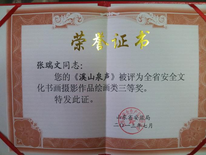 近日,剛剛揭曉的東營市安全文化書畫攝影作品有獎?wù)骷顒又?,市公交公司廣告部張瑞文的繪畫作品《溪山泉聲》以其豐富的表現(xiàn)力和感染力,獲得三等獎,此作品同時參加山東省安全文化書畫攝影有獎評比活動,亦獲得三等獎。