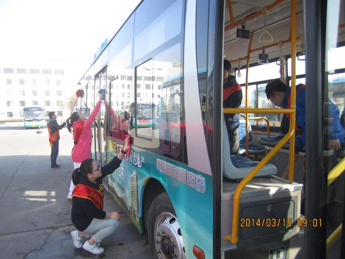 3月15日上午,市公交公司汽車一隊(duì)聯(lián)合東營(yíng)市職業(yè)學(xué)院開展了學(xué)雷鋒活動(dòng)。來自該校經(jīng)濟(jì)貿(mào)易與管理學(xué)院的大學(xué)生和車隊(duì)職工共計(jì)28人,分兩個(gè)小組,一組乘坐公交車上路為特需乘客服務(wù),幫助疏導(dǎo)乘客;一組幫助駕駛員擦拭車身,清掃車廂衛(wèi)生。大家工作起來井然有序,有條不紊,尤其活躍在車廂為乘客服務(wù)的志愿者們,更是得到了乘客的一致好評(píng),成為公交車上一道亮麗的風(fēng)景。