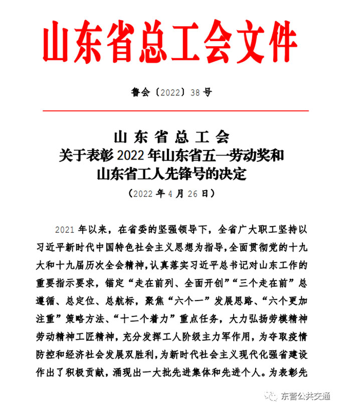 為進(jìn)一步激勵廣大職工在新時代勇?lián)率姑?,展現(xiàn)新作為,“五一”前夕,山東省總工會和東營市總工會先后印發(fā)通報表彰,對省市多家先進(jìn)集體和個人進(jìn)行表彰,東營市公共交通汽車公司駕駛員黃新強同志被評為山東省五一勞動獎?wù)?,東營市公共交通汽車公司9路車組被評為東營市工人先鋒號。