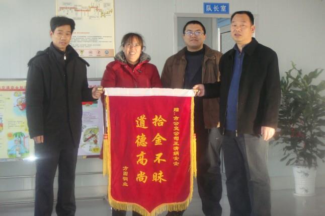 12月11日上午,東營經(jīng)濟開發(fā)區(qū)方圓銅業(yè)的武繼峰先生拿著一面寫有“拾金不昧、道德高尚”的錦旗來到市公交公司汽車五隊,感謝161路駕駛員王清娟師傅拾金不昧的高尚品德。據(jù)車隊了解得知,12月9日晚上,汽車五隊駕駛員王清娟在運行完161路班次后正常清理車廂衛(wèi)生時發(fā)現(xiàn)了一個女士皮包并立即將皮包上交車隊。車隊值班人員通過清點,發(fā)現(xiàn)皮包內(nèi)共有現(xiàn)金、手機、鑰匙、身份證、個人用品等,根據(jù)包里面的手機信息及時聯(lián)系到了失主的丈夫武繼峰先生。12月10日上午武繼峰先生帶著有效證件來車隊將包領(lǐng)回。回家后,武繼峰先生心情久久不能平靜,特意制作了一面錦旗送到車隊,代表全家來表達感激之情,武繼峰先生拿著錦旗,握著王隊長的手,非常激動的連連表示感謝,并再三要求車隊對王清娟師傅這種拾金不昧的優(yōu)良品質(zhì)進行表揚。王隊長非常坦誠的告訴武繼峰先生,拾金不昧是我們公交行業(yè)多年來始終堅持秉承的優(yōu)良傳統(tǒng),也是每名駕駛員應盡的義務,是我們公交人義不容辭的責任。