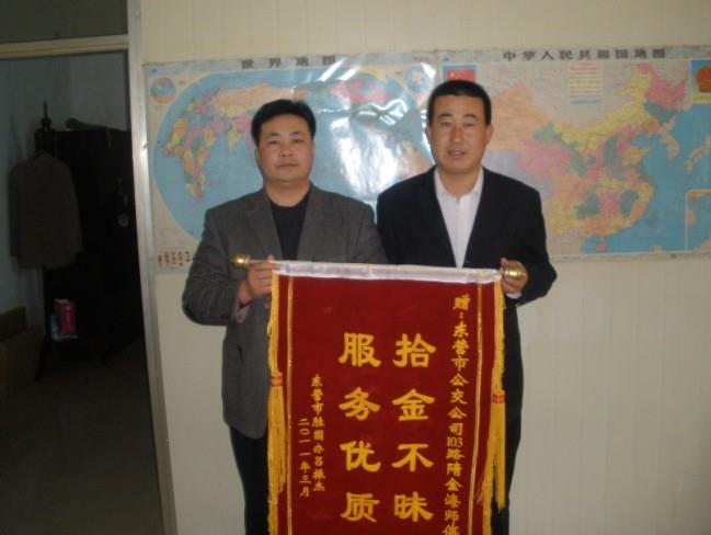 2011年3月14日下午,東營市勝園辦事處的呂振杰手持“拾金不昧,服務(wù)優(yōu)質(zhì)”的錦旗來到市公交公司汽車一隊。