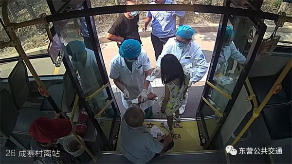 通過調(diào)閱車輛視頻監(jiān)控發(fā)現(xiàn),孫建強師傅將公交車??吭趥?cè)翻電動車前方不遠處后,就飛奔過去。這時他才看清,車里居然有三個人?!败嚴镉袃晌焕先撕鸵粋€小孩兒,而且都受了不同程度的傷,我試圖將側(cè)翻的車扶起來,無奈一個人的力氣有限?!蔽<标P(guān)頭,救援刻不容緩,他用力將三輪車朝上的一側(cè)門打開后,依次將車里的傷者救了出來?!拔蚁劝衍嚴锏睦洗鬆敱С鰜恚又研『罕С鰜?,經(jīng)詢問,大娘說她腰不敢動,我先讓她在車里調(diào)整了一個安全的姿勢,然后才把她也抱出來?!?br/> 救人后的孫建強仔細檢查了三人的傷勢,“由于電動車側(cè)翻擠壓,大爺胳膊受傷,被扎了玻璃碴子,大娘腰部受傷,小女孩的眼睛受了傷,腿也受了傷,我就趕緊撥打了120?!蓖瑫r,孫建強向所在車隊匯報了遇到的突發(fā)情況。車隊領(lǐng)導(dǎo)當即表示,安頓好車內(nèi)乘客,先救傷者。在等待救護車到來的時間,孫建強從公交車上拿了些衛(wèi)生紙和礦泉水,簡單幫三人清理了傷口。23日的東營正是高溫天,氣象臺發(fā)布了高溫紅色預(yù)警,當天的氣溫最高達到了41攝氏度,非常炎熱,“我們的公交車上都開著空調(diào),我就把他們扶到公交車上休息?!本茸o車很快就來了,醫(yī)護人員在給傷者進行包扎的時候,孫建強一邊安撫老人,一邊向老人詢問要不要幫忙聯(lián)系家人,老人告訴了他村里書記的電話。經(jīng)聯(lián)系,村大隊書記表示立即安排相關(guān)人員跟進。